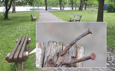 Z kolei inny nasz Czytelnik, pan Janusz, spacerując nad małym jeziorem, zapędził się w okolice parku Klenczona. Chciał wpaść do tamtejszej piwiarenki, lecz ta, jak się okazało, otwierana jest dopiero w godzinach popołudniowych. Przysiadł wtedy na pobliskiej ławeczce, ale zaraz zerwał się z niej jak oparzony. Coś boleśnie ugodziło go we wiadomą część ciała. - Nie miałem wówczas na nosie okularów, więc siadając na ławce, nie zauważyłem sterczącej z niej podwójnie kąsającej niespodzianki – skarży się nasz Czytelnik. W czym rzecz - najlepiej wyjaśni to zdjęcie. Dodajmy jeszcze, że ani się obejrzymy, a sezon turystyczny już się rozpocznie. W związku z tym warto byłoby zrobić przegląd tego typu urządzeń w mieście, by uniknąć obciachu przed przyjezdnymi.