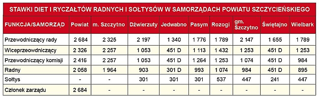 Już nie tylko samorządowi włodarze mogą się pochwalić wyższymi poborami. Ich śladem postanowili pójść radni w niektórych szczycieńskich samorządach. Tradycyjnie już najlepiej opłacani są rajcowie powiatowi, których miesięczne ryczałty od Nowego Roku wzrosły z 1960 do 2058 zł. Ich przewodniczącemu dieta podskoczyła z 2 520 do 2 684. Tuż za nimi plasują się radni miejscy, którym dieta wraz ze wzrostem minimalnej płacy wzrosła automatycznie do 1964 zł, a szefowi rady do 2 325 zł.