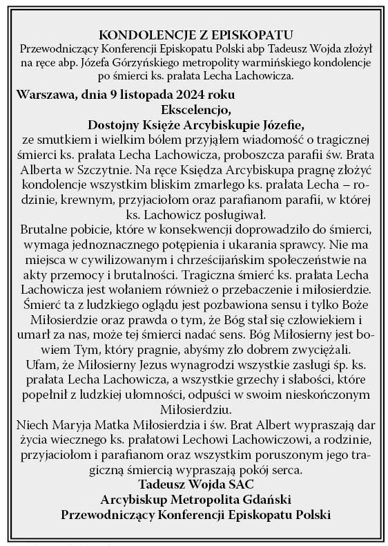 Przypomnijmy. W niedzielę 3 listopada po wieczornej mszy na teren plebanii przy kościele pod wezwaniem Św. Brata Alberta wtargnął 27-letni Szymon K., mieszkaniec Szczytna. Mężczyzna miał przy sobie metalowy toporek oraz kanister z benzyną. Po wybiciu szyby w drzwiach dostał się do wnętrza, gdzie brutalnie zaatakował proboszcza parafii, 72-letniego księdza Lecha Lachowicza, zadając mu liczne ciosy w głowę. Świadkiem zdarzenia była przebywająca na plebanii kobieta, wolontariuszka jednej z fundacji pro-life, z którą ksiądz współpracował. Najpierw ściągnęła na siebie uwagę napastnika, po czym użyła wobec niego gazu pieprzowego. To spłoszyło agresora, który uciekł. W międzyczasie kobieta wezwała policję oraz pogotowie. Nieprzytomny proboszcz trafił najpierw do szpitala w Szczytnie, a następnie został przetransportowany do Szpitala Wojewódzkiego w Olsztynie. Podejrzany o dokonanie ataku na księdza 27-latek został zatrzymany przez policjantów w poniedziałek 4 listopada rano.
