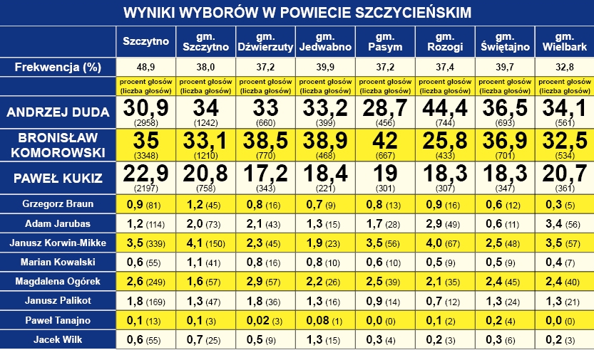 Wynik w powiecie szczycieńskim nie odzwierciedla tego na szczeblu krajowym. Tu najwięcej (8131) głosów zebrał Bronisław Komorowski, o ponad 400 więcej niż jego główny rywal Andrzej Duda (7713).