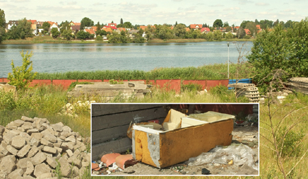 Przy okazji oglądania zdjęcia z nadjeziornej ścieżki, warto jeszcze zwrócić uwagę na widoczny w tle blaszany parkan. Obecnie mocno zardzewiały (można byłoby pokryć go jakimś efektownym graffiti) otacza rozległy plac, na którym miał powstać znakomity hotel. I co? Obecnie jest to skład trylinki starego typu i innych betonowych prefabrykatów a także składowisko rozmaitych, większych gabarytowo odpadków oraz, oczywiście, butelek. Przypomnijmy, że historia budowy hotelu sięga 14 lat. Działkę sprzedano w 2003 r., ale pierwsze prace budowlane