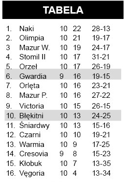 Weekendowa seria spotkań przyniosła dwie konfrontacje naszych drużyn z liderami. Zarówno Błękitni Pasym, jak i GKS Szczytno klęski nie doznali, ale dorobku punktowego nie powiększyli. Wciąż nieźle sobie radzi w okręgówce Gwardia Szczytno. Zespół Kamila Kwiatka ma na swoim koncie już pięć zwycięstw. W poprzednich rozgrywkach na piątą wygraną gwardziści musieli czekać aż do połowy kwietnia...
