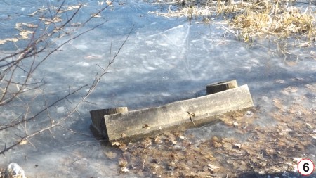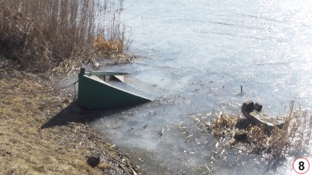 Bociany bocianami, ale w ostatnich dniach widoki mieliśmy zgoła inne niż wiosenne. Jeziora, które po kilku cieplejszych dobach powoli zaczęły tracić powłokę lodową, ponownie zamarzły. Weekendowy spacer wokół większego ze szczycieńskich akwenów umożliwił dostrzeżenie raczej nietypowych obrazków. Widać na nich zakleszczone w lodowych szponach ławkę i kosz na śmieci (fot. 6. i 7.). Bezrozumność osób, które największą przyjemność (może jedyną) czerpią z niszczenia wspólnego dobra, plus ujemne temperatury stworzyły wizje niczym z budzących grozę filmów o trwałych skutkach zmian klimatycznych. Po drugiej stronie Jeziora Domowego Dużego mieliśmy podobny obrazek (fot. 8).