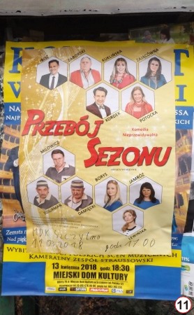 Od kilku ładnych tygodni afisze umieszczone przed MDK-iem oraz w innych punktach Szczytna zachęcały do obejrzenia spektaklu „Przebój sezonu”. Z plakatu uśmiechały się do potencjalnych widzów twarze m.in. Małgorzaty Potockiej, Krzysztofa Ibisza, Dariusza Kordka – a także nie mniej znanych aktorów z wymiennej obsady (fot. 11). Do przedstawienia firmowanego jako komedia nieprzewidywalna jednak nie doszło. Trochę przewidywalne było to, że znane nazwiska niekoniecznie w naszych warunkach wygrają z ceną biletu zbliżającą się do kwoty trzycyfrowej. Z powodu zbyt niskiej frekwencji spektakl odwołano. To nie pierwsza podobna sytuacja w naszym mieście. Miłośnikom Melpomeny pozostają darmowe przedstawienia „przy stoliku” serwowane dość regularnie w miejskiej bibliotece. Tam w zupełności wystarczy kameralna widownia.
