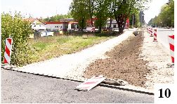 Tydzień wcześniej pisaliśmy o ścieżce rowerowej, która będzie prowadziła ze Szczytna do Olszyn. Trasa jest już w zasadzie na ukończeniu. W swoim początkowym biegu będzie się ona na swój sposób łączyła z istniejącą od paru ścieżką rowerową pociągniętą po dawnej linii kolejowej do Biskupca. Jak pewnie część czytelników kojarzy (pisaliśmy o tym swego czasu), szlak do Ochódna, Dźwierzut i kolejnych miejscowości (niedługo także Biskupca) zaczynał się nieco dziwnie – choć odbijał od dawnego przejazdu kolejowego, nie miał porządnego połączenia ani ze ścieżką pieszo-rowerową kończącą się na ul. Ostrołęckiej, ani z samą drogą. Teraz, przy okazji przebudowy wylotówki na Ostrołękę, zostanie to uporządkowane – choć dla niektórych pojawią się utrudnienia. Między drogą dla samochodów a początkiem ścieżki mieliśmy taką strefę niczyją. Przez kilka lat leżał tam żużel tworzący nawierzchnię na odcinku kilku metrów. Teraz wylewany jest w tym miejscu asfalt, ale wjazd na ścieżkę będzie możliwy tylko od strony pobliskiego zakładu pogrzebowego. Dostanie się tu np. od strony stadionu czy ul. Podleśnej raczej skutecznie utrudnią położone ostatnio krawężniki (fot. 9).