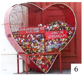 W Szczytnie i innych miejscowościach naszego powiatu dość popularne w ostatnim czasie stały się blaszane pojemniki w kształcie serc (fot. 6). Zbierane są do nich plastikowe nakrętki. Dbamy w ten sposób o środowisko, gromadząc jednocześnie fundusze na jakiś szczytny cel – nakrętki są potem sprzedawane w odpowiednich skupach. Kształt serca kojarzy się oczywiście z uczuciowością, wrażliwością. Może by jednak dla odmiany – i nie tylko – pomyśleć o nieco innym wyglądzie pojemników? Dwa i pół roku temu Szczytno przystąpiło do sieci Cittaslow. Trzeba przyznać, że w przestrzeni publicznej mamy jakoś niewiele elementów odnoszących się w widoczny sposób do tego faktu. Symbolem sieci jest pomarańczowy ślimak. Na niektórych rogatkach miasta ujrzymy niewielkie ikonki, które oko kierowcy czy pasażera być może wyłowi (fot. 7). W Pasymiu, który został przyjęty do sieci w 2014 r., takich akcentów jest więcej – figurki ślimaków zobaczymy na rynku.