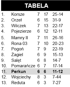 Perkun: M. Marszałek, Mikulak, Prachniewski, Sachajczuk (81. Szynkiewicz), M. Len (84. Staszewski), Kacprzak (65. Ferenc), Opalach, Dąbrowski (82. B. Mazur), Śledziński, Deptuła (83. S. Mazur), Kobus.