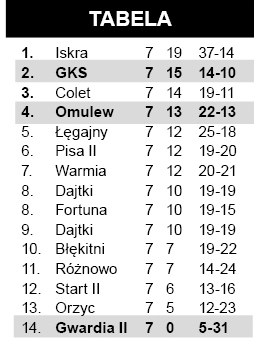 W klasie B na uznanie zasługuje zwycięstwo rezerw Błękitnych. Pasymianie wprawdzie swojego miejsca w tabeli nie poprawili, ale mogą się cieszyć z wyjazdowej wygranej z wiceliderem, który wcześniej kroczył od zwycięstwa do zwycięstwa. Komplet punktów gościom zapewniła strzelecka dyspozycja grającego trenera Arkadiusza Forusia. Sporo emocji było w Olszynach. Początek spotkania nie zwiastował małego festiwalu bramkowego, ale po golu Kamila Kraseckiego worek się rozwiązał. Goście z Wielbarka prowadzili już 2:0, jednak w końcówce musieli ratować zwycięstwo.Swój dorobek powiększyły rezerwy Perkuna. Sędzia pokazał w meczu z Warmianką aż trzy czerwone kartki. Już w pierwszym minutach arbiter usunął z boiska po zawodniku każdej z drużyn, a orzynianie kończyli spotkanie w dziewięciu.