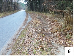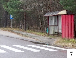 Zapomnieniu ulegają nie tylko stare cmentarze – zdarza się, że coś stosunkowo nowego również traci rację bytu i ulega stopniowemu zniszczeniu. Taki los spotkał np. w miarę nową zatokę autobusową znajdującą się blisko opisywanego cmentarza w Nowym Gizewie. Zatoka znajduje się tuż za obszarem zabudowanym i była ostatnim przystankiem przed pętlą przy oczyszczalni ścieków. „Pętla” to słowo lekko naciągane – do oczyszczalni docierały jeszcze niedawno nieliczne kursy jednej z odnóg linii nr 3. Według obecnego rozkładu autobusy już tam nie zajeżdżają, a przystanek wygląda, jakby za parę miesięcy miał się wtopić w las (fot. 6). Zatoka wraz z chodnikiem została przykryta prawie w całości błotem, igliwiem i mchem. Tylko trochę lepiej wygląda przystanek skierowany w drugą stronę. Tu oprócz sukcesywnie zarastającej zatoki mamy specyficznie ustawioną i trochę już niekompletną wiatę (fot. 7) , za którą znajdziemy pojemniki po różnych trunkach.