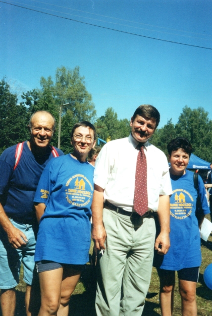 Tak też się stało i w 2002 r. aż 24-osobowy „kręciołowy” peleton pomknął na Kurpie. Przystrojeni w pomarańczowe koszulki – prezent od redakcji „Kurka Mazurskiego” - wnet wmieszaliśmy się w barwny tłum i po chwili sami przypominaliśmy pracowite pszczółki, bo wszystkiego chcieliśmy skosztować i z politykami się sfotografować. Tym razem politycy urzędowali na scenie i był mały problem, bo przemawiali i ot tak sobie nie można było wkroczyć na otoczoną tłumem estradę i stanąć do wspólnej fotki. Jako zawzięta łowczyni unikatowych fotek z politykami poprosiłam jednego z ochroniarzy, by pozwolił mi wejść na scenę od zaplecza, ponieważ dostrzegłam, że Józef Oleksy skończył wypowiedź i mam szansę na wspólną fotografię. Roześmiał się tylko i ani drgnął, wówczas zawołałam: „Panie premierze, może pana marynarkę przymierzę?!” Polityk spojrzał w moją stronę i już wiedziałam, że spełni moje marzenie, szybko podałam aparat koleżance i z kolegą Krzysiem już po chwili właśnie na scenie (choć od zaplecza) pozowaliśmy do zdjęć.
