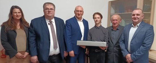 W miniony wtorek Marcin Denkiewicz dołączył do grona stypendystów Fundacji Humanus Czesława Nowakowskiego. Ten biznesmen i mecenas sztuki jest znany z organizowania plenerów malarskich w Czarnym Piecu. Jak jednak sam przyznaje, większą satysfakcję sprawia mu niesienie pomocy innym, a taką możliwość daje założona pięć lat temu Fundacja. Stypendystów wybiera zespół opiniujący, w skład którego wchodzą starosta Jarosław Matłach i wójt gminy Jedwabno Sławomir Ambroziak. W działalność Fundacji zaangażowani są także były włodarz Jedwabna Włodzimierz Budny i jego żona Henryka. Wszyscy oni, wraz z dyrekcją ZS nr 3 oraz uczniami, uczestniczyli w wręczeniu Marcinowi Denkiewiczowi nagrody rzeczowej w postaci laptopa. Czesław Nowakowski wyraził nadzieję, że sprzęt ten pozwoli zdolnemu uczniowi rozwijać pasję i jeszcze lepiej zgłębiać starożytne dzieje. Marcin otrzymał też prezent od wójta Ambroziaka – jego książkę o generale Samsonowie wraz z dedykacją.