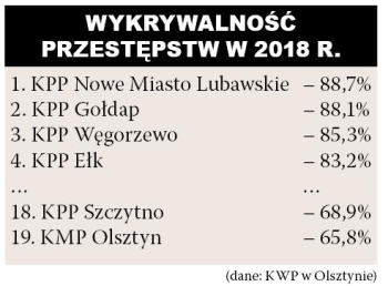 Niespełna dwa tygodnie temu, podczas odprawy rocznej podsumowującej pracę szczycieńskiej komendy w 2018 r., jej szef, mł. insp. Tomasz Bzymek, przedstawił statystyki dotyczące m.in. wykrywalności przestępstw. Podkreślał, że w omawianym okresie odnotowano tendencję wzrostową w postępowaniach wszczętych oraz spadek przestępstw stwierdzonych. Zwrócił także uwagę na „znaczny wzrost wykrywalności”. To prawda, ale nie cała. Zamieszczone na stronie internetowej Komendy Wojewódzkiej Policji w Olsztynie dane nie są dla szczycieńskiej jednostki korzystne.{akeebasubs !*}