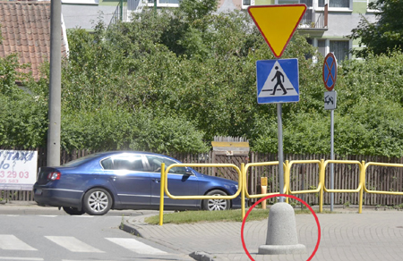 W innym miejscu, a konkretnie przy skrzyżowaniu ul. 1 Maja z ul. Leyka, na co zwracają uwagę nasi Czytelnicy, stoi z kolei znak „ozdobny”. Cechuje się on tym, że w odróżnieniu od innych nie tkwi bezpośrednio w chodniku, a wyrasta z betonowego, ozdobnego dzwonu.