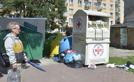 Mieszkanka ul. Lipperta, pani Maria alarmuje redakcję w sprawie pojemników na używaną odzież. Właśnie przy jej ulicy stoi taki element, ale jego otoczenie wygląda jak istne pobojowisko. Walają się wokół niego torby z odzieżą, która już nie zmieściła się do środka. - Jak to wygląda – załamuje ręce pani Maria i dziwi się, czemu pojemnik nie jest systematycznie opróżniany.