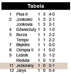 Zespół z Dźwierzut udanie zainaugurował rozgrywki, pokonując na wyjeździe spadkowicza z klasy okręgowej. Gola na wagę trzech punktów zdobył Wójcik, który wykorzystał podanie Kołakowskiego.