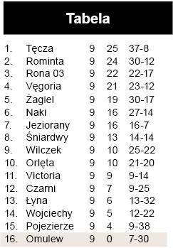 jego koledzy z drużyny. Wielbarczanie po zmianie stron mieli dwie dogodne okazje. Zarówno Abramczyk, jak i Musioł zdecydowali się na strzał, choć lepszym rozwiązaniem byłoby podanie. Po drugiej z tych sytuacji Tęcza wyprowadziła kontrę, akcja przeniosła się błyskawicznie na przedpole bramki Omulwi, a sędzia uznał, że obrońca gospodarzy interweniował nieprzepisowo w polu karnym i podyktował jedenastkę. Piłka po strzale odbiła się od ręki Przybysza, jednego słupka, drugiego i przekroczyła linię bramkową… W doliczonym czasie miejscowi mogli wyrównać, ale po zamieszaniu w polu karnym i strzale Szczepkowskiego bramkarz wybił futbolówkę nogą.
