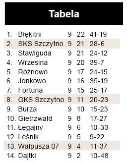 Podopieczni Marcina Cieślika odnieśli planowe zwycięstwo, będące przy okazji najwyższą wygraną SKS-u w A-klasie. Szczytnianie na tle przeciwnika zaprezentowali się na poziomie zadowalającym i sukcesywnie dokładali kolejne trafienia. W drugiej połowie skład gości został uszczuplony o dwóch zawodników – najpierw za nieeleganckie dyskusje z sędzią wyleciał bramkarz, a pod koniec dołączył do niego kolega z zespołu. Przed szczytnianami wyjazdowe spotkanie z liderem, który w miniony weekend raczej nieoczekiwanie doznał pierwszej w sezonie porażki.