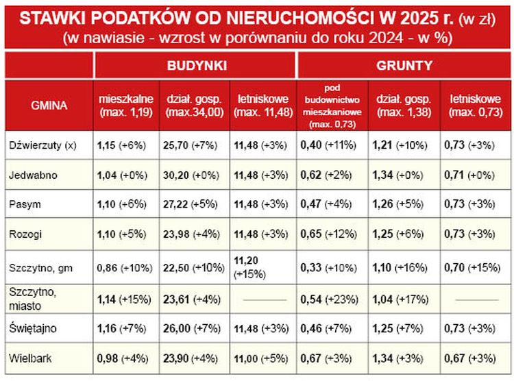 Od 3 do 23% wzrosną w 2025 roku poszczególne stawki podatku od nieruchomości w gminach powiatu szczycieńskiego, przy zakładanej inflacji w wysokości 5%. Na największy „skok” zdecydowano się w stolicy powiatu, gdzie w trzech spośród czterech najistotniejszych dla mieszkańców kategoriach podwyżka sięgnęła od 15 do 23%. Na drugim biegunie jest gmina Jedwabno, w której stawka podatku wzrośnie, i to nieznacznie, tylko za budynek letniskowy (3%) i grunt pod mieszkaniem (2%).