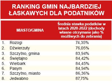 Gminy powiatu szczycieńskiego nie obciążają swoich mieszkańców zbyt dużymi podatkami. Tak wynika z rankingu pisma samorządowego „Wspólnota”. W latach 2020-2022, którego on dotyczy, najniższe daniny lokalne w województwie warmińsko-mazurskim płacili mieszkańcy gmin Rozogi i Dźwierzuty. Wśród miast Szczytno było na drugim miejscu, a w gronie miasteczek Wielbark zajmował 3., a Pasym – 5. pozycję.