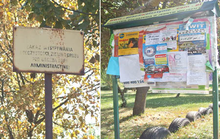 Do ławeczek przyczepić się nie sposób, ale ich tło... Jak widać na fotografii, tuż za ławeczkami w ciasnym szeregu tłoczy się rząd zużytych opon. Niestety, nie zadają szyku, a odwrotnie - wyglądają obciachowo. Z kolei nieco w głębi trawnika stoi zardzewiała tabliczka z prawie nieczytelnym napisem, zakazująca wysypywania nieczystości, ziemi i gruzu. No i jeszcze ta tablica informacyjna z ogłoszeniami naklejonymi jedne na drugich.