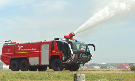 Jak piszemy w innym miejscu, lotnisko w Szymanach jest z zasadzie gotowe, a nad bezpieczeństwem startujących tam i lądujących maszyn, co ma nastąpić w niedalekiej przyszłości, czuwa jednostka ratowniczo-gaśnicza. Jej siedziba znajduje się w eleganckim nowym budynku, a wyposażenie jest bardzo nowoczesne. W budynku garażują m. in. dwa supersamochody strażackie panther firmy Rosenbauer, przeznaczone specjalnie na lotniska. Są to tak potężne maszyny, że ze względu na gabaryty nie mogą poruszać się po drogach publicznych. Za to możliwości mają ogromne. Moc silnika przekazywana na wszystkie sześć kół wynosi ponad 700 KM. Poza tym maszyna może zabrać ze sobą przeszło 12 ton środków gaśniczych, a linia natarcia jest zdolna dostarczyć 7 000 l wody i środków gaśniczych w ciągu minuty. Na zdjęciu panther z Szyman podczas demonstracji mocy.{/akeebasubs}