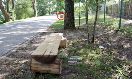 Ławka stoi samotnie, bez kosza na odpadki, który jest znacznie od niej oddalony (biały otok). Biesiadnicy przestawili ją w bardziej cieniste miejsce. Na dostawienie śmietnika nie starczyło już im chyba sił, ani chęci, no i mamy to co mamy, czyli bałagan.