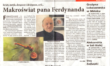 Z kolei w październikowym wydaniu „Tygodnika Siedleckiego” ukazał się artykuł „Makroświat pana Ferdynanda” , rzecz o wystawie fotografii Ferdynanda Sosnowskiego, którego naszym Czytelnikom nie trzeba przedstawiać. Wystawę urządzono nie byle gdzie, bo w Akademickiej Galerii Fotografii w Siedlcach.