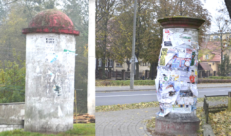W Pasymiu mają też podobne do naszych słupy ogłoszeniowe, a jeden z nich prezentujemy na zdjęciu. Jak widać zwieńczony jest on kopułą, która nadaje mu dostojnego kształtu. Należy sądzić, że pasymskie i szczycieńskie słupy kiedyś były wykonane według takiego samego wzoru, ale niestety, nasze utraciły czapy i obecnie są tępo ucięte, wskutek czego wyglądają znacznie gorzej. Dodatkowo na ich wygląd wpływają jeszcze strzępy plakatów zwisające dość żałośnie.
