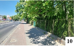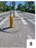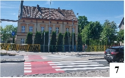 W tamtym rejonie trwały najbardziej intensywne prace związane z malowaniem oznakowania poziomego. Świeże linie kontrastują z wciąż niezamiecionym piachem – i to blisko centrum miasta (fot. 8) . Być może wszechobecny pył sprawia, że nawet dopiero co położona farba na przejeździe dla rowerzystów prezentuje się mało efektownie (fot. 9) . Można odnieść wrażenie, że Szczytno otoczone jest przez pustynię, wiejące wiatry wciąż nanoszą piasek, a biedne służby nie wiedzą, co z tym począć.