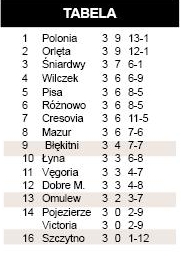 W znacznie gorszych humorach byli po weekendzie derbowi rywale Omulwi, czyli piłkarze Błękitnych. W Lidzbarku Warmińskim mieli niewiele do powiedzenia z silnym, jak się okazuje, beniaminkiem. Wszystko rozstrzygnęło się w zasadzie już w pierwszej połowie, a po zmianie stron samobójcze trafienie dołożył Stańczak. Ba, a co dopiero mówić na temat nastroju w SKS-ie. W dwóch kolejnych spotkaniach podopieczni Mirosława Rusieckiego stracili aż dziesięć bramek, nie zaliczyli ani jednego trafienia i są na dnie tabeli. – Nie graliśmy źle. Wynik nie oddaje tego, co działo się na boisku – o meczu z Orlętami mówi Waldemar Pogorzelski z klubowego zarządu. I faktycznie, coś złego zaczęło się dziać dopiero w ostatnich 20 minutach, kiedy zemściły się niewykorzystane sytuacje, a mecz zakończył się klęską. – Nie ma co płakać nad rozlanym mlekiem – próbował uspokajać Waldemar Pogorzelski. Kibice liczyli, że SKS wróci na właściwe tory w meczu z niby słabszym niż w poprzednim sezonie zespołem z Różnowa. Wrócił, ale na tarczy, po raz kolejny tracąc grad bramek w ostatniej fazie pojedynku.