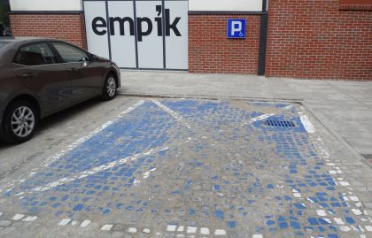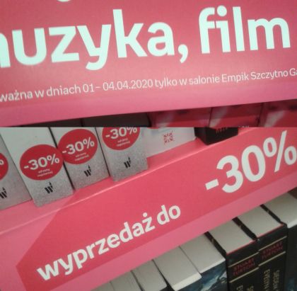 Najbliższą księgarnię tego typu (czyli z prasą – także zagraniczną) mieliśmy przez lata w Olsztynie przy ulicy 1 Maja, kawałek za teatrem. Z czasem empik przeniesiono na pobliską ul. Piłsudskiego, a obecnie stolica województwa takie salony ma trzy. Od minionego czwartku nie musimy już do Olsztyna jeździć, bo empik zaczął działać w Szczytnie – jako drugi punkt w powoli otwieranej galerii Jurand. Z niezmienionych tabliczek na półkach wynika, że salon miał być czynny półtora miesiąca wcześniej (fot. 4). Na dolnej części zdjęcia może nas trochę zdziwić napis WYPRZEDAŻ – przecież sklep został świeżo otworzony. Do świeżości nie pasuje trochę zdarta już niebieska farba na znajdującym się tuż obok salonu miejscu postojowym przeznaczonym dla zmotoryzowanych niepełnosprawnych (fot. 5).