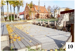Parę numerów wstecz pisaliśmy o dość szybko pościeranej warstwie ochronnej na mobilnych siedziskach ustawionych kilka miesięcy temu na placu Juranda. Równie nowa jest drewniana konstrukcja przylegająca do zamkowej fosy, wykorzystywana w wakacje do organizacji kameralnych koncertów. Nowa, ale także już wyblakła. W czerwcu była brązowa, lecz teraz niemal w całości stała się ona jakaś taka szarobura (fot. 10) . Przy okazji zaobserwowaliśmy, że dość szybko wymieniono sznurkowe barierki, zmieniając jednocześnie ich naciąg. Ruiny zamkowe wciąż zatem żyją…