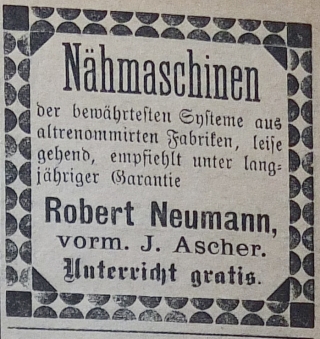 J. Ascher handlował ubraniami. Jego sklep znajdował się przy ulicy Marktstrasse 66, przy głównym skrzyżowaniu.