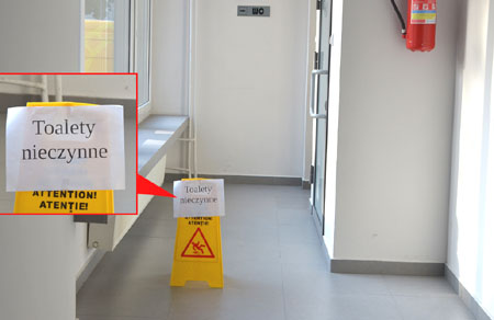 Swoją drogą, oprócz zdawkowego „toalety nieczynne” powinna być dodana informacja, aby udać się na piętro, albo w przeciwnym kierunku, tam gdzie są garderoby.