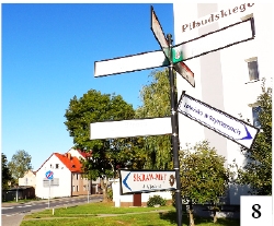 W dzisiejszych czasach coraz mniej zmotoryzowanych zatrzymuje się przy krawężniku, by zapytać przechodnia o to, jak dojechać w dane miejsce. Wiadomo – technika zrobiła swoje i potrzebne informacje znajdziemy zazwyczaj w nowoczesnych telefonach. Z drugiej strony przestrzeń wyglądałaby dość dziwnie, gdyby usunąć z niej wszystkie tablice kierunkowe, ponieważ można sobie bez nich poradzić. W Szczytnie od lat stoją w ważniejszych punktach słupki kierujące do rozmaitych obiektów, instytucji itp. Już jakiś czas temu dostrzegliśmy, że w pobliżu ronda Kresowiaków (skrzyżowanie ulic Polskiej, Wileńskiej, Piłsudskiego i Leyka) tabliczka wskazująca dojazd do portu lotniczego w Szymanach jest zwrócona w odwrotną stronę, czyli w kierunku Akademii Policji, a dalej Ostrołęki. Na dodatek ostatnio puściło jedno mocowanie (albo ktoś „pomógł”) i całość wygląda mało godnie (fot. 8).