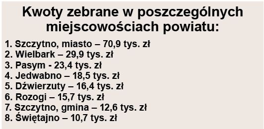 Podczas 31. finału Wielkiej Orkiestry Świątecznej Pomocy w powiecie szczycieńskim znów padł rekord. Oba sztaby – w Szczytnie i w Wielbarku zebrały w sumie blisko 190 tys. złotych! To o prawie 20 tys. zł więcej niż przed rokiem. Tradycyjnie już dużą popularnością cieszyły się orkiestrowe licytacje, a pomysłowość darczyńców nie miała granic.