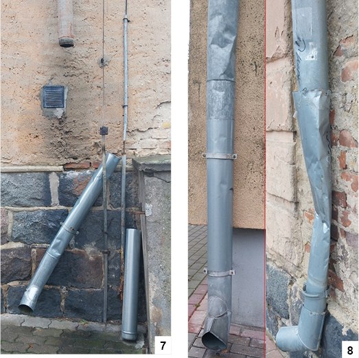 Na pewno większość naszych Czytelników doskonale zna frazeologizm „trafić z deszczu pod rynnę”. Ileś tego typu sformułowań odnosi się do realnych sytuacji z mniej lub bardziej odległej przeszłości. Dziś pod główną częścią rynny nic złego nas spotkać nie powinno, a rury odpływowe kończą się albo w kanalizacji, albo na tyle nisko, że wejść pod nie się raczej nie da. Odnosimy wrażenie, że w Szczytnie od pewnego czasu najgorzej wskutek ludzkich zaniedbań bądź czyjejś bezmyślności na wszystkim wychodzą... same rynny. Do poczynienia obserwacji w tym zakresie nakłonił nas nasz Czytelnik – pan Ireneusz. Niepokoi go wygląd rynien (czy konkretnie rur spustowych) na wielu miejskich budynkach. Zachęcił nas do przyjrzenia się dla przykładu stanowi tych urządzeń na niektórych obiektach na ulicach Barczewskiego i Lipperta. No to się przyjrzeliśmy (fot. 7, 8) . Jak widać, rura spustowa w pierwszym z tych miejsc jest z jakichś powodów rozczłonkowana. Częstszy widok stanowią wgniecenia – to efekt tłuczenia ręką, kopania nogą, a może bezmyślnego walenia głową. Deszcz raczej tego nie zrobił...