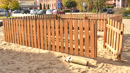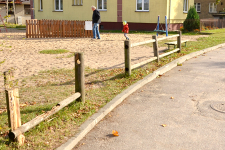 W opisywanym parku nad małym jeziorem zauważyliśmy, niestety, pewną niemiłą niespodziankę. Tuż pod piaskownicą spoczywa spory fragment drewnianego okrąglaka. W dodatku leży tuż pod furtką, stanowiąc zagrożenie dla bawiących się dzieci, które mogą się o niego potknąć i nabić sobie guza. Zastanawialiśmy się skąd to się wzięło, ale już po chwili zagadka znalazła swoje rozwiązanie. Od ul. Żwirki i Wigury zielony teren oddzielony jest drewnianym płotkiem. Jacyś wandale po prostu zniszczyli to ogrodzenie, a powyrywane elementy rozrzucili po całej okolicy.