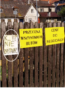 Często ograniczają się jedynie do wywieszenia informacji NIE ZASTAWIAĆ, licząc, że kierowcy do szkoły chodzili i prosty przekaz zrozumieją. Jeden z użytkowników garaży przy starym targowisku na ul. Żeromskiego wywiesił sporą tabliczkę, opisującą, czego nie należy pod czyimiś drzwiami robić (fot. 2 ). Ostrzeżenie odwołuje się do Prawa o Ruchu Drogowym.{akeebasubs !*}