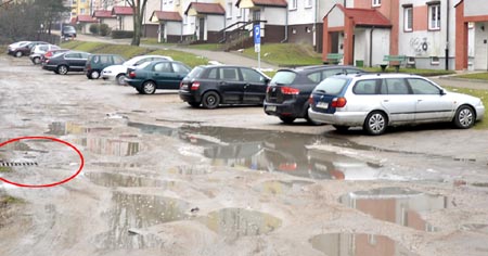 Fatalny stan ulicy Wańkowicza to nie jedyna bolączka jej mieszkańców. Zaraz za widocznym na poprzednim zdjęciu żywopłotem rozciąga się rozległy parking, z którego korzysta wielu kierowców. Niestety, wyglądem nie różni się on od ulicy. Tu także królują dołki i górki oraz wszechobecne kałuże. - Bez gumiaków do samochodu nie podchodź – skarżą się mieszkańcy. Plac parkingowy, jak i ulica leżą na gruntach miejskich, więc o wyjaśnienia zwróciliśmy się do Urzędu Miejskiego. Ratusz obiecuje wyrównać nawierzchnię ul. Wańkowicza oraz parkingu i nawieźć kruszywa, ale wówczas, gdy poprawi się pogoda, czyli jak będzie sucho.
