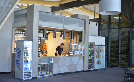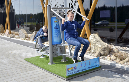 Choć nie bardzo pamięta się na lotnisku o rowerzystach, to dbałość o pasażerów jest wielka. I nie chodzi tu tylko o wygodę przed podróżą, ale i po. Oto przed terminalem zauważyliśmy przyrządy do... ćwiczeń fizycznych. Zapewne chodzi o to, by rozprostować kości po dłuższym locie (na zdjęciu na pierwszym planie ćwiczy pani Aleksandra, mieszkanka okolic). A może, by po prostu zrzucić zbędne kilogramy nie tyle po powietrznych wojażach, co wizycie w lotniskowych punktach gastronomicznych. Działa tu bowiem mała restauracyjka-bar, w której można zjeść coś na szybko – placki ziemniaczane, naleśniki albo pierogi, no i napić się kawy, herbaty lub lemoniady. Nie jest to jeszcze lokal oferujący konkretne i bardziej wyszukane dania, ale i na niego wkrótce przyjdzie pora. Rzecz w tym, że wystrój restauracji musi spełniać lotniskowe wymagania. Odpowiedni kształt muszą mieć fotele, stoliki itp., co okazało się nie takie proste i stąd opóźnienia. Obecny punkt gastronomiczny czynny jest codziennie do godz. ok. 18.00 i nieco później w soboty – do chwili przylotu ostatniego samolotu.