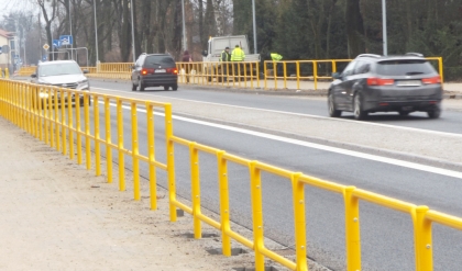 Co widać jeszcze? Z pewnością ulica Piłsudskiego dość wyraźnie zmieni swój wygląd. O prawdziwym archipelagu drogowych wysepek różnego przeznaczenia już pisaliśmy. Policji, straży pożarnej i pogotowiu pracy to nie ułatwi – mamy tylko po jednym pasie ruchu w każdą stronę. Równie widoczne są żółte barierki (wyższe i niższe) oddzielające jezdnię od chodnika (fot. 5). Informowaliśmy wcześniej, że nie będzie oddzielnej ścieżki rowerowej. Zamiast tego postanowiono, że po obu stronach ulicy będzie można jeździć na rowerze po chodniku (fot. 6). Wymalowano już stosowne piktogramy (fot. 7), z których jednoznacznie wynika, że trakt będzie wspólny, bez żadnych linii oddzielających, a pierwszeństwo będą mieli oczywiście piesi. Co ciekawe, nie ustawiono znaków zakazujących poruszania się rowerem po asfalcie. Czy to wszystko tworzy na pewno dobre i bezpieczne rozwiązanie?