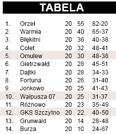 Omulew: Gwiazda, A. Cieślik, Chorążewicz (65. Krasecki), Szczepkowski, Janowski (83. Kempiński), Raniecki (84. Olender), Pliszka (30. Szlaga), D. Kołakowski (40. Ambroziak), Borowski, Remiszewski, M. Abramczyk.