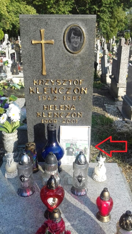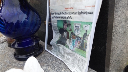 W naszej kulturze mamy kilka sposobów okazywania na grobach w widoczny sposób swoich uczuć do zmarłych. Najoczywistsze są znicze, wieńce, stroiki i kwiaty, czasami najbliżsi kładą czy stawiają przedmioty odnoszące się do osoby, która odeszła. W ostatnim czasie na grobie Krzysztofa Klenczona pojawił się dość nietypowy dodatek (fot. 5). Strzałka wskazuje na białą oszkloną ramkę, która kryje… prasowy wywiad z fanem wokalisty Czerwonych Gitar. Rozmówca ma na imię Krzysztof (nadane na cześć artysty), urodził się w roku, w którym Klenczon zmarł, w domu urządził minimuzeum poświęcone artyście, zna jego żonę Alicję oraz dzieci i mieszka w świętokrzyskim Jędrzejowie. W tekście i na zdjęciach pojawia się kilka szczycieńskich akcentów. Niestety, gazetowy wycinek jest niedopasowany do rozmiarów ramki, szybka pękła, a całość wygląda po prostu nieestetycznie (fot. 6). Nie wiemy, kto ową formę upamiętnienia muzyka na jego grobie umieścił (możemy się tylko domyślać), ale do pomysłu mamy poważne zastrzeżenia.