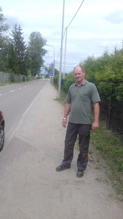Pan Andrzej Morka (fot. 8) pokazuje nam stan najbardziej zapiaszczonego odcinka chodnika, odcinka w trochę nietypowy sposób granicznego. Choć tablica z napisem SZCZYTNO znajduje się jeszcze kawałek za aparatem fotograficznym, którym wykonano zdjęcie, to już od widocznego w tle zjazdu zabudowania leżące przy chodniku należą do Korpel – granica między miejscowościami biegnie wzdłuż drogi.