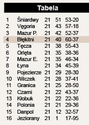 Trwa piękna seria Błękitnych, którzy są w tej chwili najskuteczniejszą drużyną w lidze. Ostre strzelanie w sobotę zaczęło się już w 6. min i trwało aż do doliczonego czasu gry, gdy M. Nosowicz dobił uderzenie Malanowskiego. Ten drugi po raz kolejny w tym sezonie błysnął instynktem snajperskim, zdobywając cztery bramki. - Jest frekwencja na treningach. Atmosferę zbudowaliśmy bardzo dobrą – cieszy się trener Daniel Włodkowski. Dość nieoczekiwanie Błękitni włączyli się do walki o awans do IV ligi. - Chcemy zająć jak najlepsze miejsce. Nikt nikogo nie ciśnie – tłumaczy pasymski szkoleniowiec.