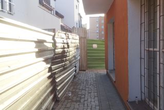 Remontowany jest także budynek znajdujący się tuż przed galerią – patrząc od strony ul. Ogrodowej (fot. 5). Naprzeciwko „Juranda” mamy niedawno odnowiony blok, ale po drugiej stronie galerii (uliczka między Ogrodową i Odrodzenia) jest już znacznie gorzej, by nie powiedzieć – obciachowo. Z ciekawości przeszliśmy krótkim pasażem między kamienicami na ul. Odrodzenia i ogrodzeniem terenu budowy (fot. 6). Zastanowiła nas informacja powieszona na płocie – mocno już nieaktualna (fot. 7). Wręcz rozpaczliwie wygląda teren kawałeczek dalej. Obok galerii stoi opuszczony budynek mieszkalny – z wybitymi szybami, odpadającym tynkiem itd. Droga wzdłuż niego wygląda chyba jeszcze gorzej (fot. 8). Korzystają z niej mieszkańcy kamienic z ul. Odrodzenia, ale to, w jaki sposób przedostają się przez ogromne i dość głębokie kałuże (swoje robi też częściowe oblodzenie gruntu), pozostaje ich słodką tajemnicą…