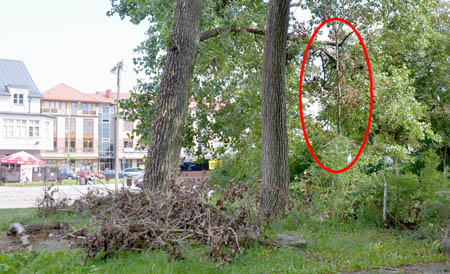 W innej części miasta, a konkretnie przy ul. Linki czai się z kolei niebezpieczeństwo w postaci opadających gałęzi. O tym zagrożeniu poinformowali nas taksówkarze, którzy na tamtejszym postoju oczekują na pasażerów. Niebezpieczeństwo grozi nie tylko klientom taxi, ale i tym, którzy pozostawili tam swoje samochody, jak i autom, bo jak wiadomo postój połączony jest z ogólnodostępnym parkingiem. Gałęzie spadają od dłuższego czasu, bo widać cały ich stos i to obok drzewa, z którego aktualnie zwiesza się wielki konar – szczegół zaznaczony na zdjęciu czerwonym otokiem.