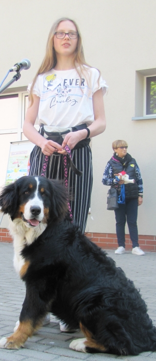 Aż dwie nagrody – za najlepszą prezentację i najlepiej wytresowanego psa otrzymała Bella Sary Wójcik. To zaledwie 8-miesięczna suczka rasy berneński pies pasterski. Pochodzi z hodowli w Bełchatowie, a jej rodzice występowali na wielu wystawach. Ona jednak na co dzień pracuje jako pies terapeutyczny z dziećmi niepełnosprawnymi w SOSW w Czarni i Poradni Psychologiczno – Pedagogicznej w Myszyńcu. Oprócz niej, Sara ma jeszcze owczarka niemieckiego i labradorkę Tolę, która także jest psem terapeutycznym. Mama Sary, pani Wioletta, która od siedmiu lat prowadzi dogoterapię podkreśla, że kontakt niepełnosprawnych dzieci z psami czyni prawdziwe cuda. - Zdarza się, że dzieci niemówiące, głęboko upośledzone, po takiej terapii zaczynają wypowiadać pojedyncze słowa. Kontakt z psami niesamowicie je motywuje, wzbudza w nich poczucie wartości – mówi pani Wioletta. Powołuje się na przykład chłopca, który nie mówił. Po zajęciach z labradorką Tolą, na widok pani Wioletty zaczął wypowiadać ... imię psa. Bella ma w przyszłości zastąpić swoją starszą koleżankę labradorkę. Obecnie sprawdza się w pracy z dziećmi z porażeniami i autyzmem. Ma ku temu odpowiednie predyspozycje, bo jest zrównoważona i spokojna. Można to było zaobserwować podczas wystawy, kiedy niemal każdy chciał ją pogłaskać, albo zrobić jej zdjęcie z innymi psami, a ona cierpliwie znosiła wszelkie objawy zainteresowania.