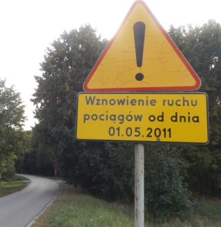 W Polsce lubimy rozprawiać o historii i utrwalać w ten czy inny sposób pamięć związaną z ważnymi wydarzeniami. Takim doniosłym wydarzeniem było prawdopodobnie wznowienie ruchu pociągów na odcinku Szczytno-Wielbark. Miało ono miejsce – jak informuje znak ustawiony przed przejazdem znajdującym się na drodze w kierunku tzw. Strugi – 1 maja 2011 roku (fot. 12). W tym momencie oczywiście żartujemy, bo znak „inne niebezpieczeństwa” ustawiono nieco przed tym terminem, by ostrzec kierowców, że po nieczynnych od paru lat torach będą się przemieszczały składy towarowe do i z ówczesnego wielbarskiego Swedwoodu. Składy z drewnem po odnowionych wtedy torach za bardzo się jednak nie przemieszczały, ale linia wkrótce i tak ożyła. Tabliczka przetrwała w niezłej kondycji ponad 7 lat, treść napisu wygląda w 2018 roku dość dziwnie, ale nikt nie stwierdził, że może pora ją zdjąć, by przeszła do historii.